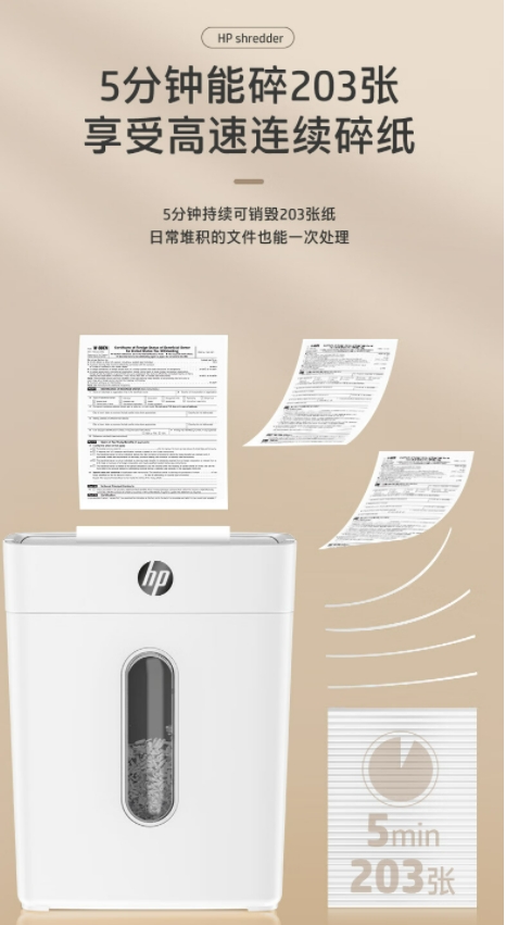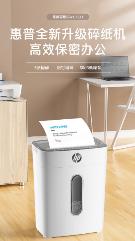 HP惠普(HP)4级保密办公家用碎纸机粉碎机 (单次6张 连续碎5分钟 15L 可碎卡碎订书针)W1505CC