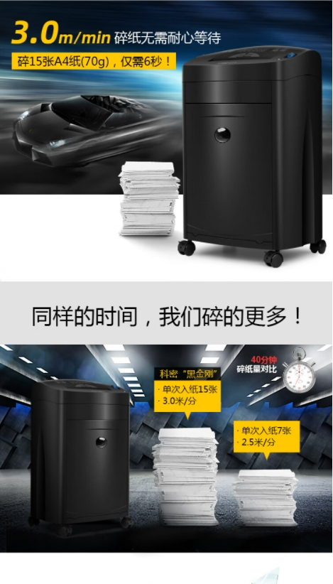 科密单次15张大吞吐长时间专业销毁碎纸机 办公商用粉碎机( 持续40分钟 碎卡/光盘)黑金刚 comet