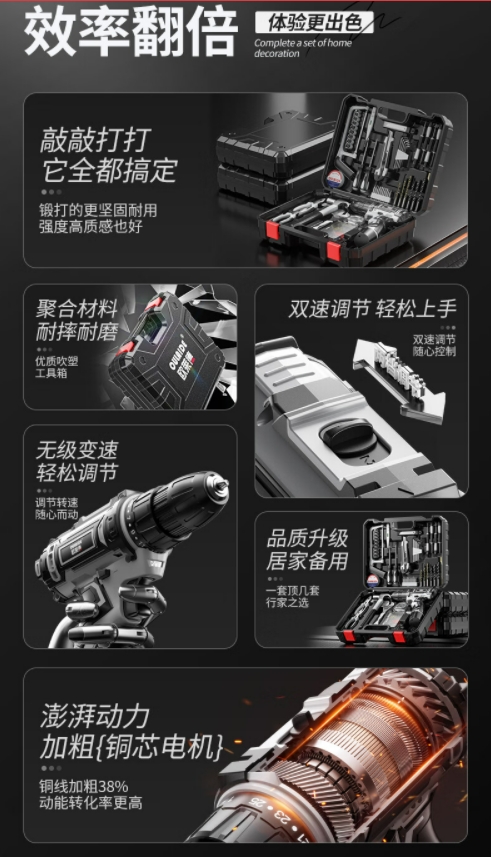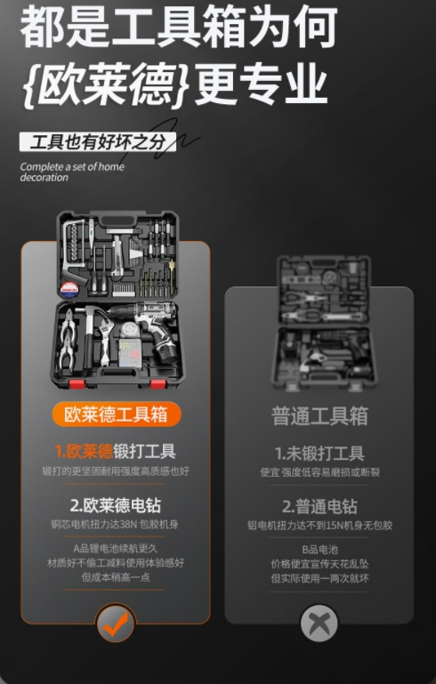 欧莱德(OULAIDE)德国充电电钻家用手电钻工具箱套装维修组合五金工具箱套装螺丝刀 锂电家用升级100件套铨能装单电